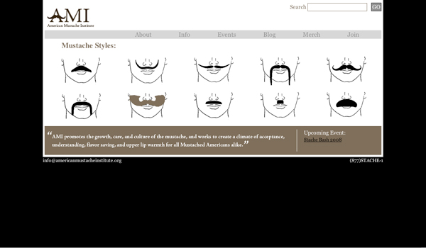 A redesign of the american mustache institute's website. It instills a classical institutional feel while setting the standard for satiric content about mustaches. Go to Full website.