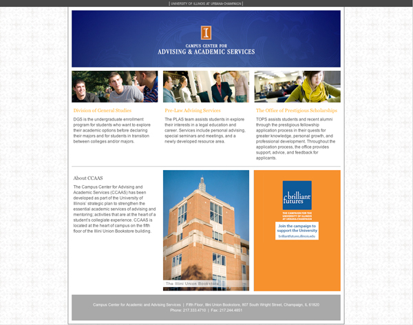 a revamp of the CCAAS website, the Campus Center for Advising and Academic Services. The website is used as a portal to three other sites affiliated with CCAAS. The site uses a simple three column layout with a color scheme that adheres the the university's colors. Go to Full website.