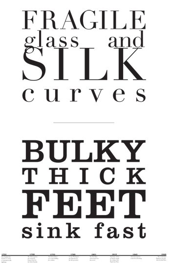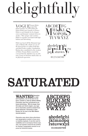 Type specimen posters comparing the typefaces Clarendon and Didot. Each poster compares a different quality of each typeface, wordsets and character sets.